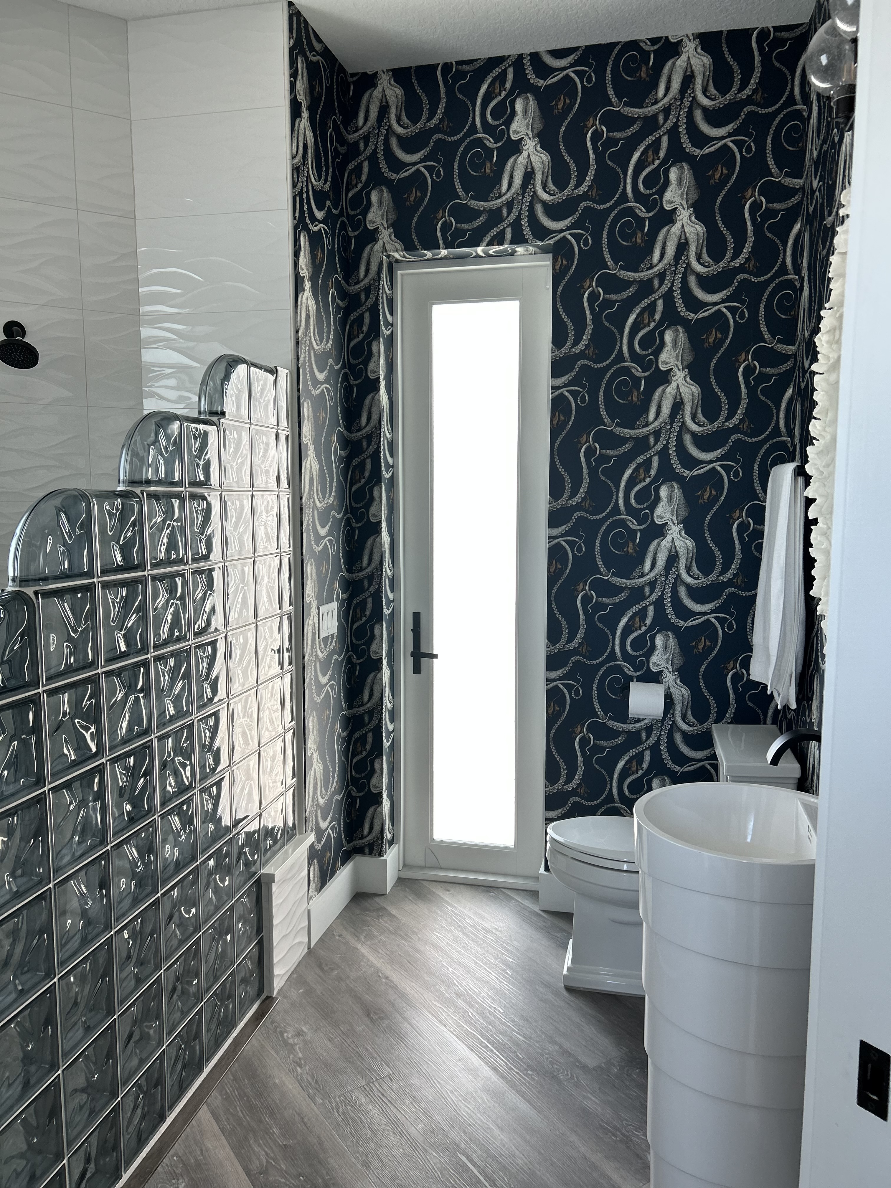 Dive into whimsy with this octopus-inspired pool bathroom where deep-sea drama meets coastal charm. Bold navy wallpaper swirls with tentacles, while crisp white fixtures, playful petal mirror and glass block shower walls are details that keep things fresh and fun. It’s the perfect splash of personality for post-swim primping!